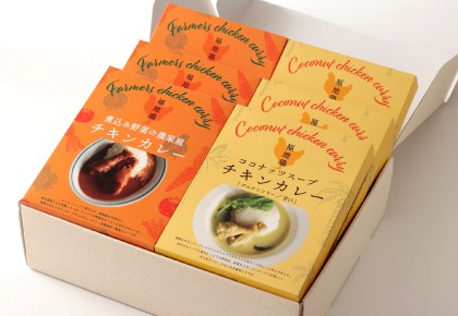 2つの味のチキンカレーを一度に楽しめる詰め合わせセットです。どちらにも、福地鶏の手羽元が入っており、食べごたえ抜群!それぞれの旨み・甘味の違いをお楽しみください。忙しい時のお食事やカレー好きなあの人へのギフトとしてぜひお買い求めください。