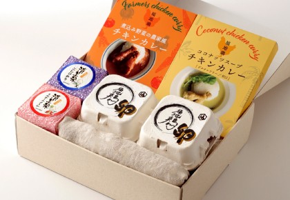 チキンカレーのレトルト2種類と、福井県産のお米と新鮮な福地鶏の卵をお届けします。特別な日の贈り物にも最適な一品です。
